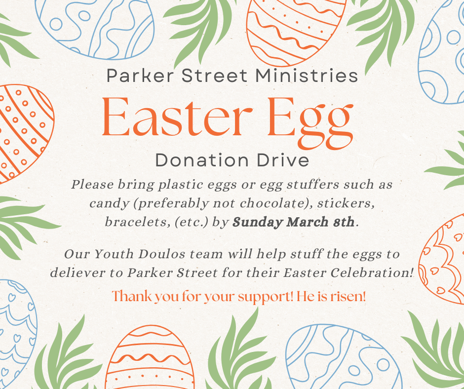 All donations of plastic eggs and/or stuffers must be brought into the lobby by Sunday, March 8th.